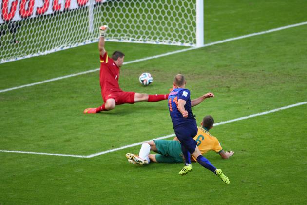 From the very start both teams put considerable pressure on each other, leading to a slightly messy but not unexciting first 10-15 minutes of the game. The first goal of the match, scored by Robben in the 20th minute, is immediately countered by means of a disgustingly beautiful goal by Ozzy top scorer Cahill 70 seconds later. The game was fairly balanced up until this point, yet, after this beauty of a goal the Ozzy Boys become dominant and put the Dutch defence into some real trouble.
